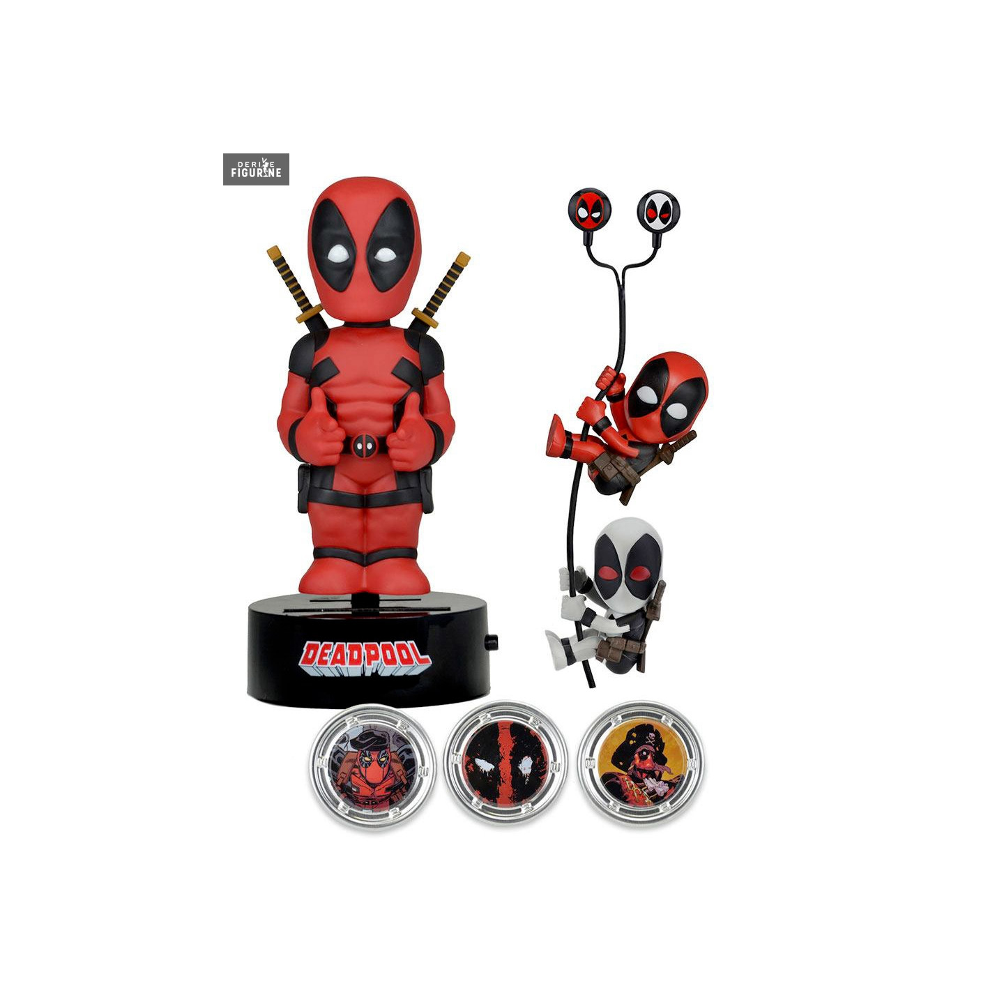 Here is a pack for Deadpool fans with several items in it. Let's start with the three Hubsnaps, then come the two Scaler that you can hang on any wire whose pair of headphones provided. Finally, the most important is probably the figure of Deadpool.