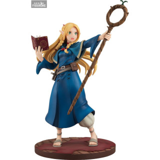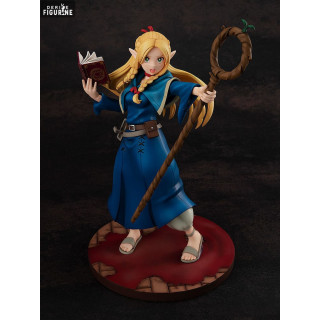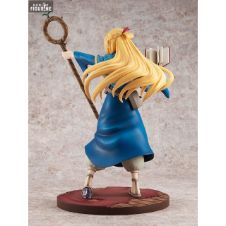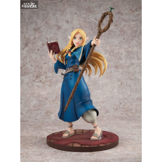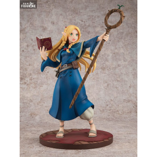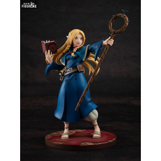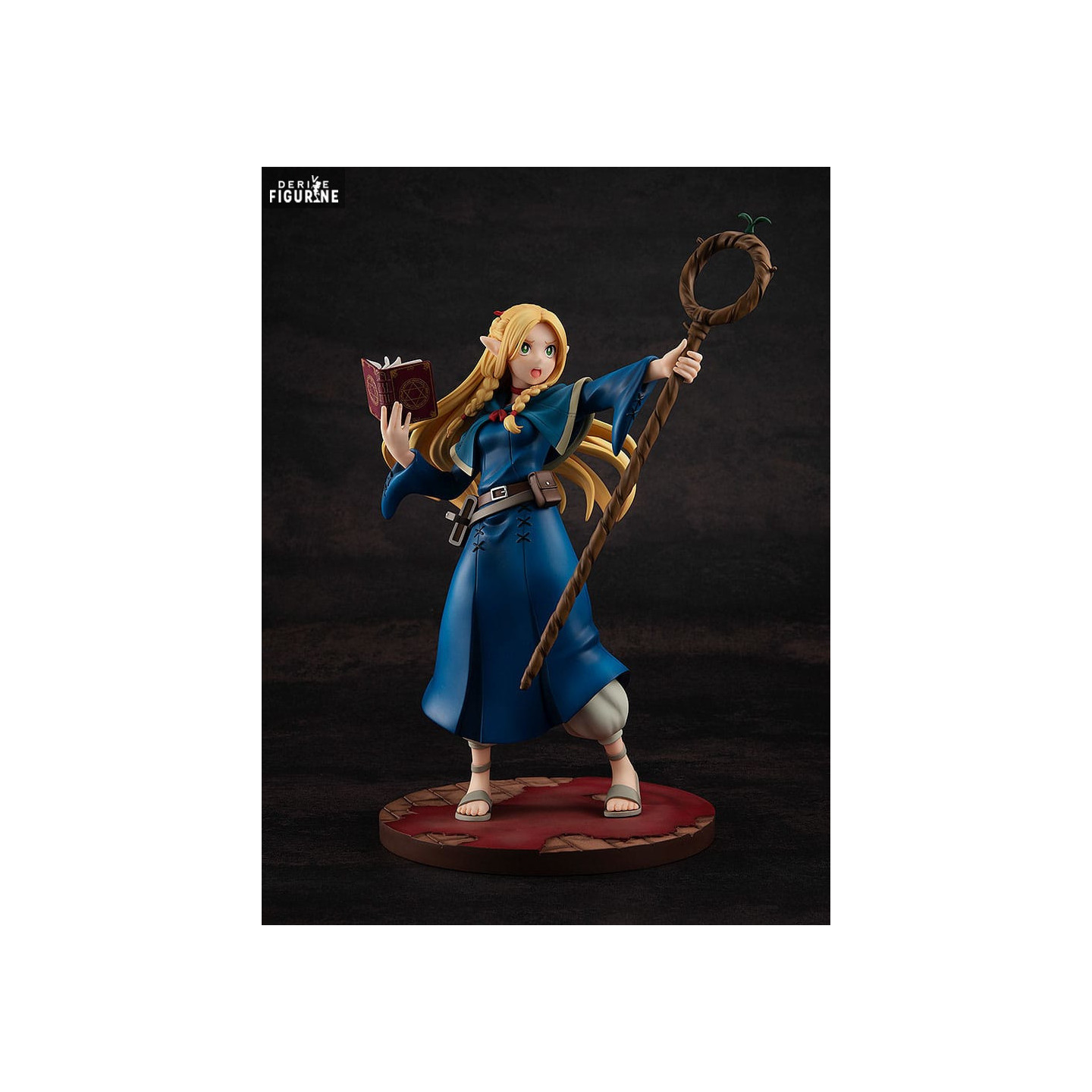 Marcille, with her long braided blonde hair and pointed ears, is depicted in a dynamic and confident pose, holding a grimoire in one hand and a mage's staff in the other. His determined expression reflects his studious nature and his willingness to help his friends in their quest to save Falin. The figure highlights her iconic costume, a blue dress adorned with subtle and faithfully reproduced details, complemented by accessories that add a touch of realism to the whole.