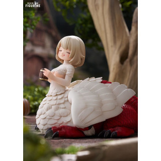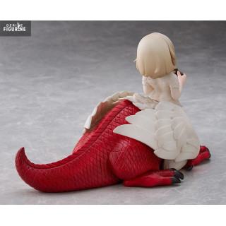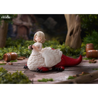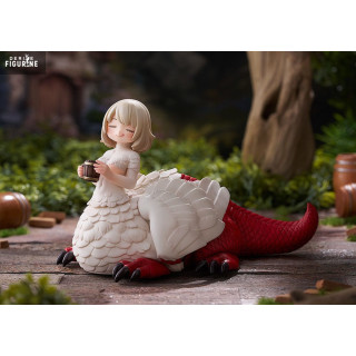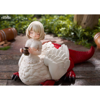 This approximately 15 cm tall PVC statuette highlights her serene human bust, half-lidded eyes, and a slight, satisfied smile. Her dragon body, with pearly white scales and a vivid red tail, lies peacefully on the ground as she cradles a steaming bowl of broth in her clawed hands. The contrasting textures—silky feathers, rugged scales, and glossy glaze—add a tactile richness to the piece.