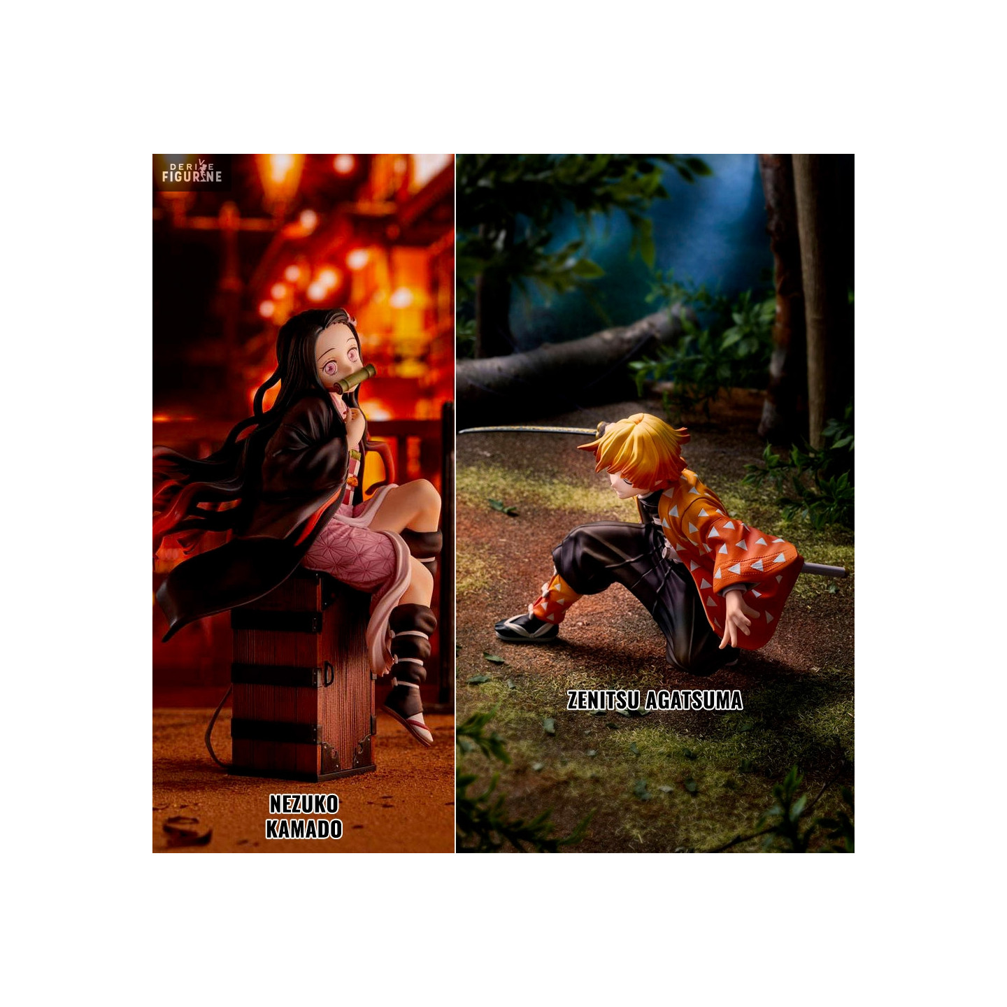 Official figure of your choice between Nezuko Kamado (~16 cm) or Zenitsu Agatsuma (~12 cm) in PVC, scale 1/8. The manufacturer is Aniplex.