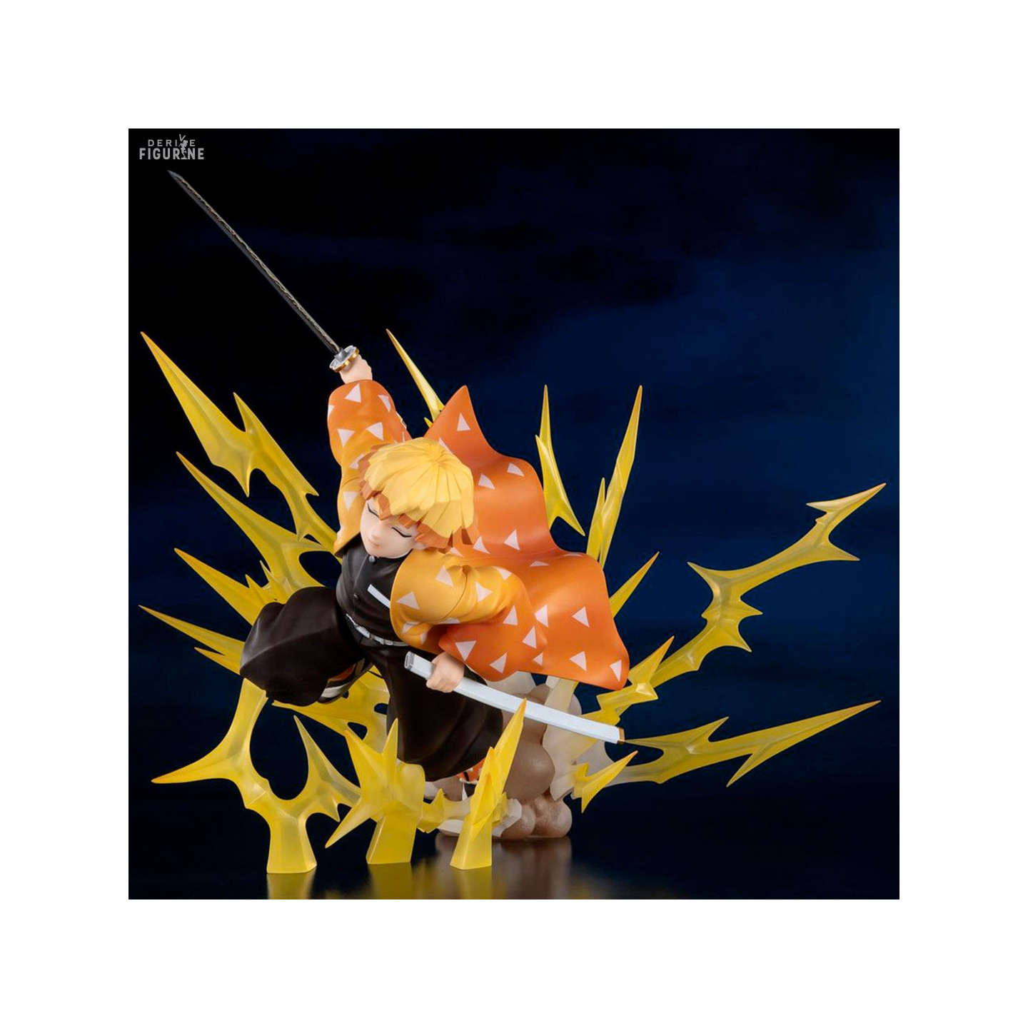 In the anime Demon Slayer: Kimetsu no Yaiba, Zenitsu Agatsuma is a character perfectly mastering close combat with his electronic blade and his incredible speed. However, he is a funky young boy and a womanizer. However, as shown in this figurine where it is in a Thunder Breathing version in the FiguartsZERO range, Zenitsu is formidable for its enemies and it is better not to underestimate it ... Indeed, when it manages to fall asleep during the fight, it is quite another Zenitsu which intervenes!