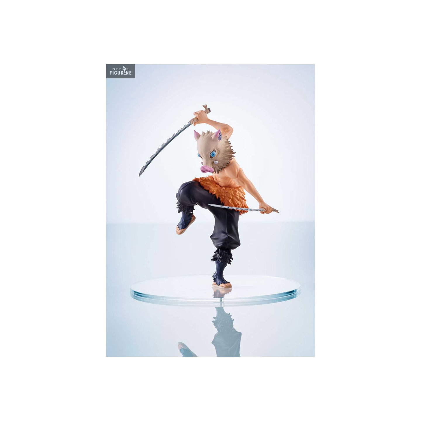 This figure perfectly captures Inosuke's raw energy and wild nature. His dynamic pose, with both dual-edged nichirin blades raised for an attack, showcases his aggressive and fluid fighting style. Every detail is meticulously crafted, from the realistic texture of his boar mask to the faithful reproduction of his minimalist fur outfit, reflecting his close bond with nature. His tense muscles and intense expression embody the untamed spirit of this unique character.