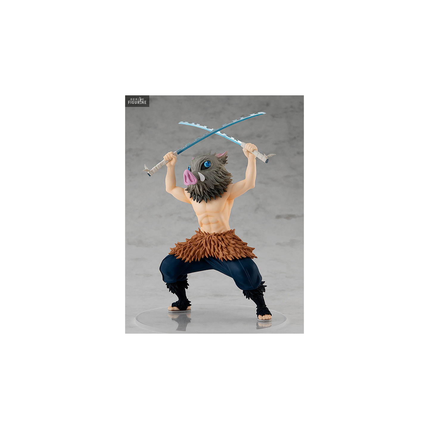 This figure perfectly captures his untamed energy and determination in battle. In a dynamic and offensive pose, Inosuke wields his dual serrated nichirin blades with an intensity that reflects his wild and unpredictable fighting style. The details on his boar mask, with piercing blue eyes and menacing tusks, are meticulously crafted, as are his iconic fur skirt and muscular torso. Every element emphasizes the primal and unique nature of this character.