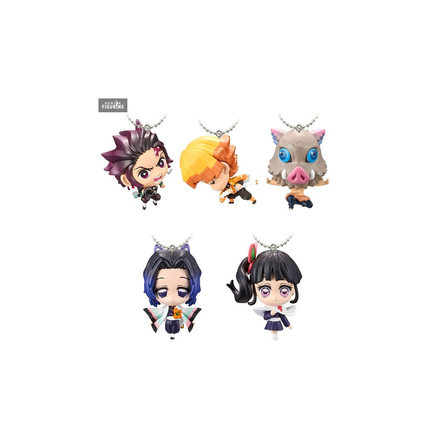 The Demon Slayer Kimetsu No Yaiba volume 2 Deformed Mascot keychain collection offers you to choose between different demon slayers: Tanjiro the hero, Zenitsu the womanizer, Inosuke with his boar mask, Shinobu of the insect's breath or Kanao of the breath of the flower.