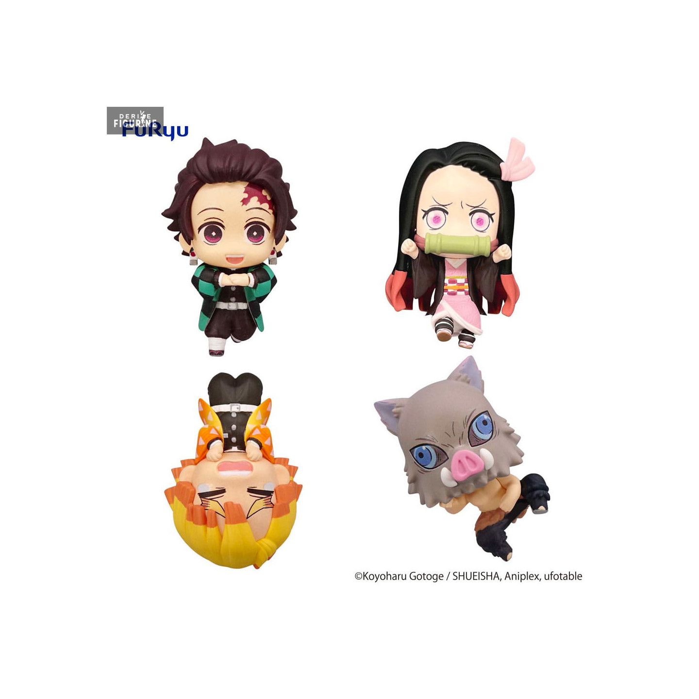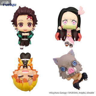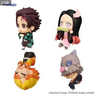 Official figures of Tanjiro, Nezuko, Zenitsu and Inosuke in PVC which measure approximately 4 centimeters high. They are from the Chokotto Hikkake Petit collection. The manufacturer is FuRyu.