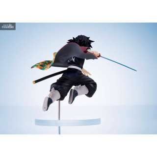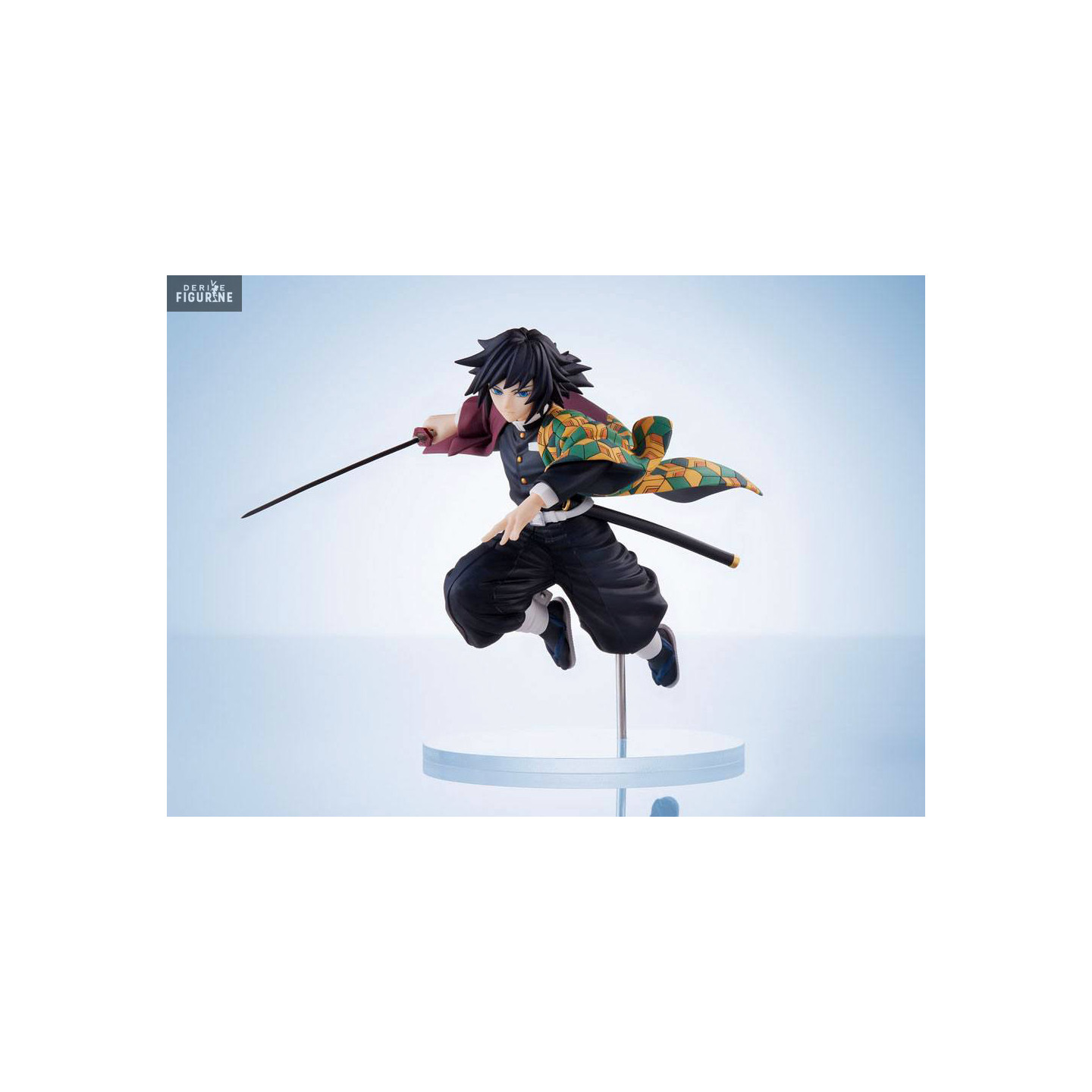 The figure measures 14cm high and is made of high quality PVC, ensuring durability and fine detail. Giyu is shown in full action, performing one of his signature fighting moves. His posture is captured with kinetic precision, emphasizing the strength and speed of his attacks. The dynamism of the pose is accentuated by the visual effects of the water which appears to gush around him, reflecting his ability to manipulate his element with spectacular ease.