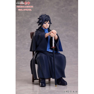 The figure depicts Giyu seated on a chair, in a meditative and relaxed pose, with his hands resting on his katana. The details of his attire are meticulously sculpted, featuring textures that replicate the fabric and traditional patterns. His impassive expression and the way he holds his sword convey the mastery and calmness that characterize him, even in the most critical moments.