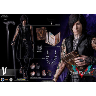 For most of the game, it's not entirely clear who V is, other than that he's helping Nero on his quest. Her dress look is quite dark and her body is almost completely covered in tattoos. He also has cloth clothes, a cane and a book.