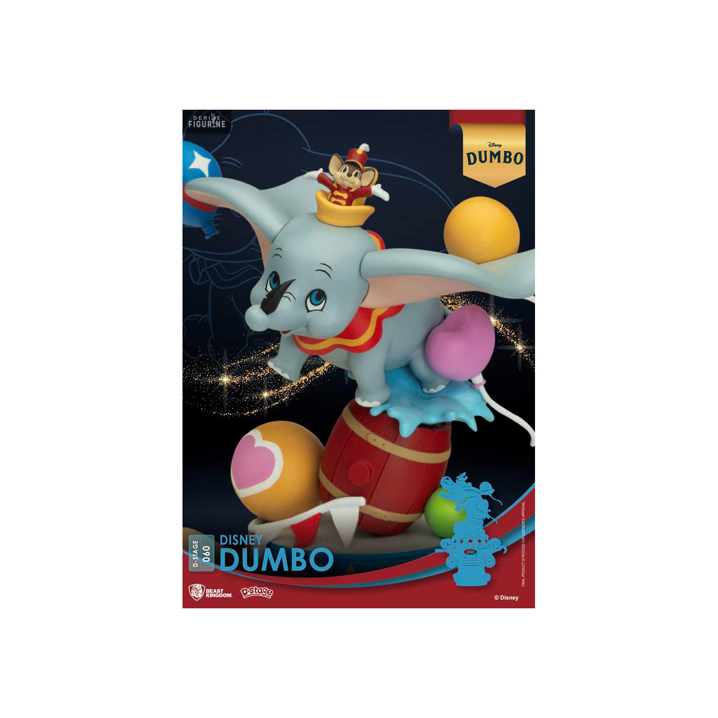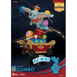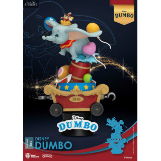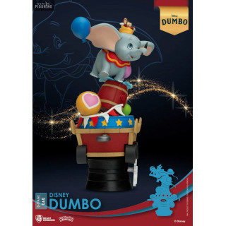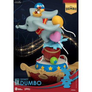 This 15-centimeter PVC figurine, part of Beast Kingdom's D-Stage collection, perfectly captures all the magic and innocence of Dumbo. Perched on a circus wagon-shaped base adorned with colorful details, Dumbo is depicted in a dynamic pose, flying proudly with his outstretched ears and surrounded by balloons. The meticulous finishes and vibrant colors highlight every detail, making this piece a true treasure for Disney fans. Beast Kingdom has excelled in faithfully conveying the character's essence and the enchanting atmosphere of the film, making this figurine a must-have for any collector or Disney enthusiast.