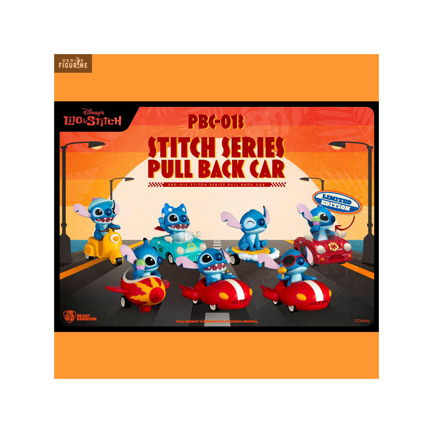 Want to race wildly with your friends? In this case you are lucky because you have just six small carts with Stitch at the wheel. To find out which version will be the best, simply pull your vehicle back and let go to see it roll. This display includes six cars placed in surprise boxes. Collect the set for a chance to win limited edition characters!