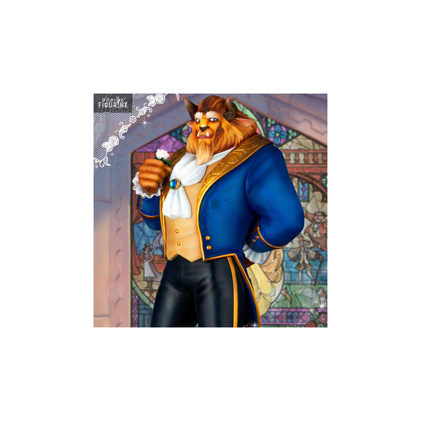 The Beast figure is dressed in a classic tailcoat, with the exquisite collar details matching Belle's dress perfectly. Each element of the figure, carefully hand-crafted and expertly painted, recreates the detailed facial expressions and realistically renders the Beast's commanding presence.