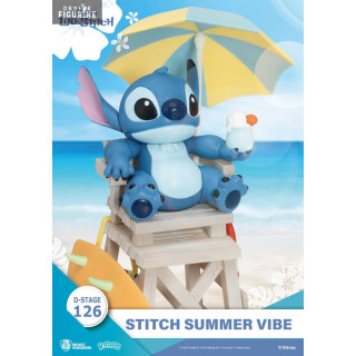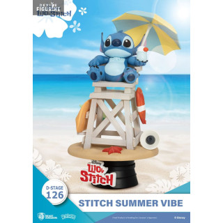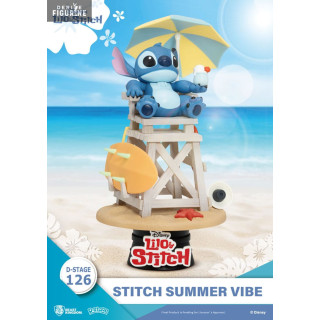 Official figure of Stitch, Summer Vibe in PVC which measures approximately 16 centimeters high. It is from the D-Stage collection. The manufacturer is Beast Kingdom.