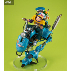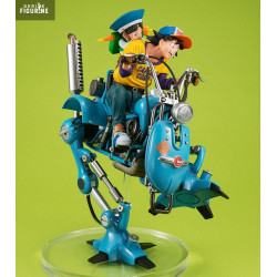 The design faithfully reproduces every detail: Goku in casual clothes with a colorful cap and t-shirt, Gohan in his blue school uniform, and the bright blue robot with mechanical features reminiscent of Akira Toriyama’s inventive world. Careful sculpting of expressions and machinery adds realism and flow.