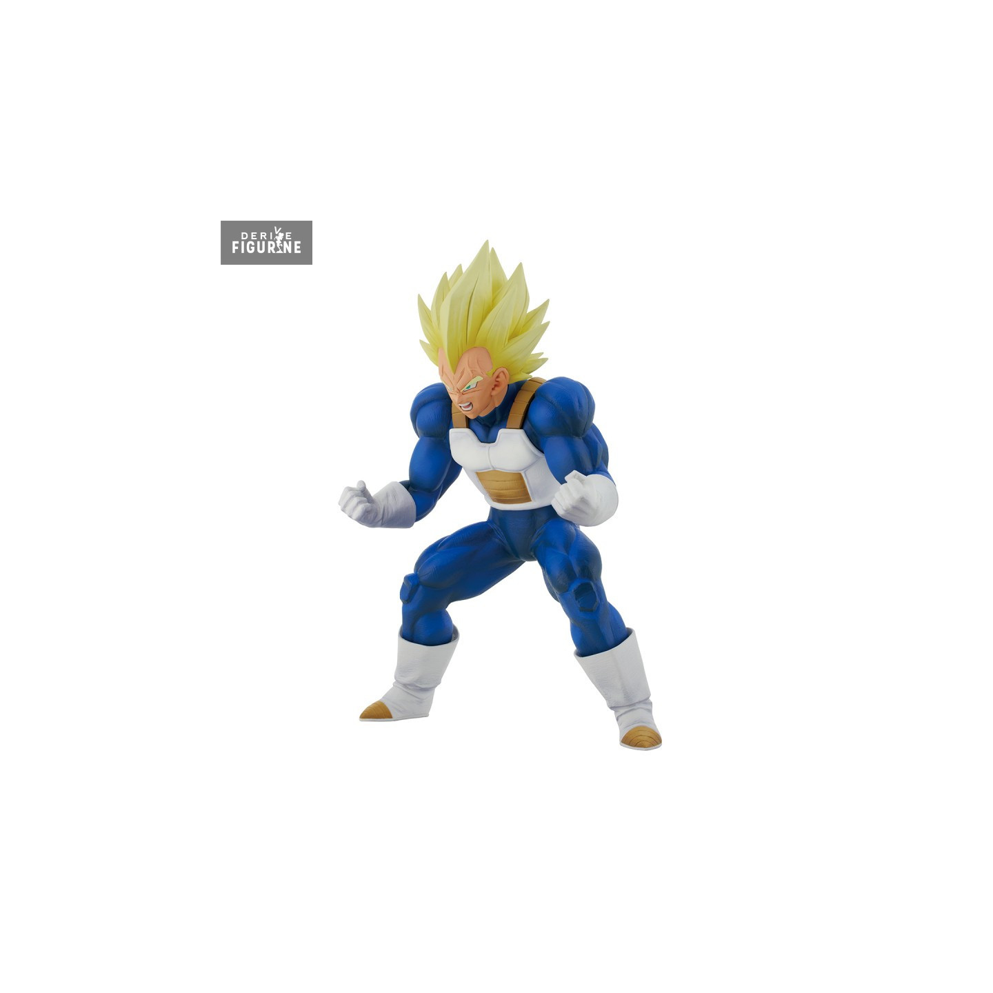 Vegeta is captured in full swing, golden hair flaming and eyes electrified with Saiyan energy. The dynamic posture suggests the raw power and determination of the Prince of Saiyans as he prepares to face his most formidable opponents. The minute details, from the tense muscles to the folds of his outfit, pay homage to the exceptional quality of the Dragon Ball Z series.