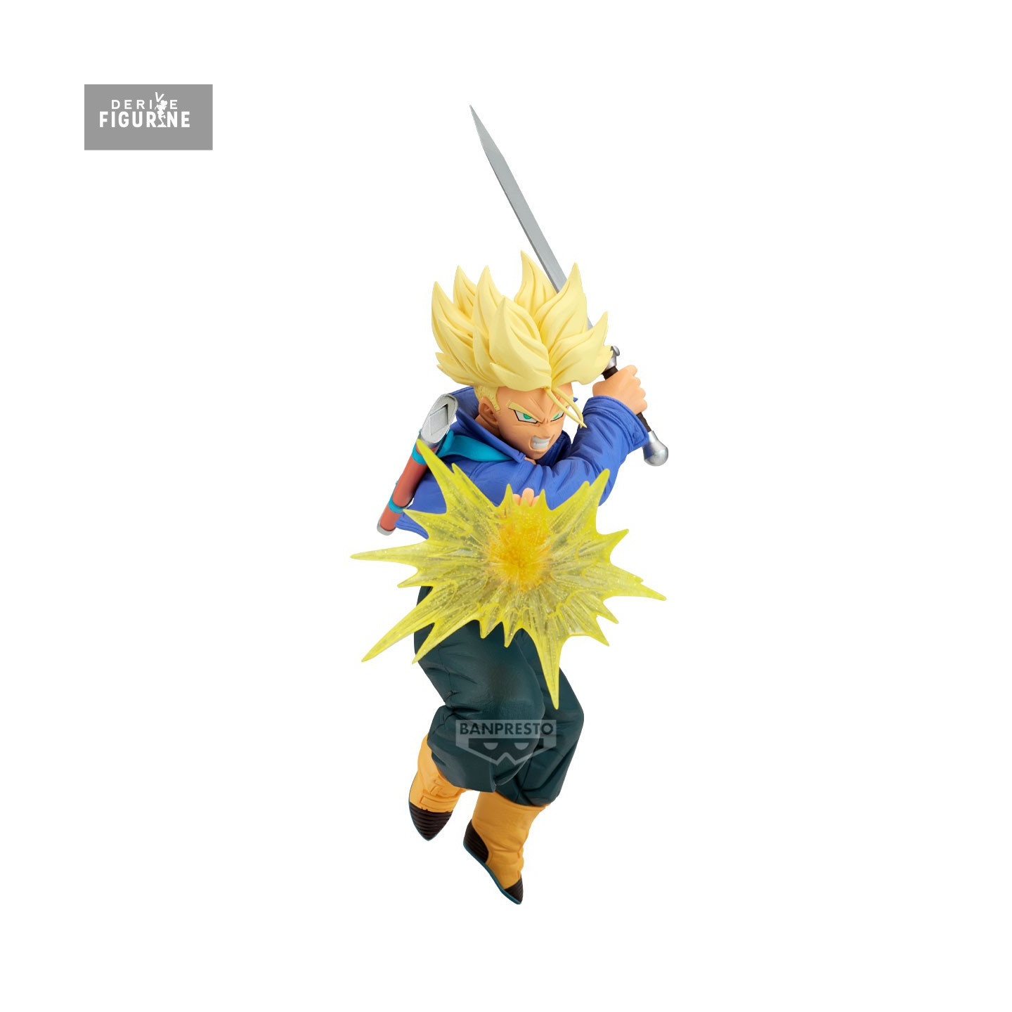 In this G×Materia figure, Trunks is captured mid-stride: sporting his Super Saiyan hair, he raises his sword high overhead, ready to deliver a decisive blow. He wears his navy blue jacket with shoulder pads, dark trousers, and yellow boots, with the red scabbard slung across his back. A yellow sculpted energy burst at his waist amplifies the attack’s intensity.