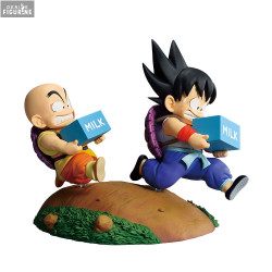 This figure captures the two young students mid-run, each carrying a box of milk while dashing along a rocky path. Their facial expressions are full of personality: Goku’s trademark strained smile shows his effort, while Krillin grits his teeth, clearly struggling. The scene perfectly portrays their friendship and lighthearted rivalry.