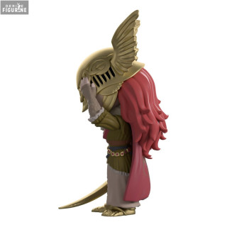 Check out this 14 cm vinyl figure: her winged helm conceals a determined face, save for a subtle curved line of her lips hinting at her focus. Beneath the visor, her crimson hair cascades from a crimson cloak, while intricately runed gold armor molds to every curve. She holds her curved blade, etched with filigree, poised to spring from her gauntleted hand at any moment.
