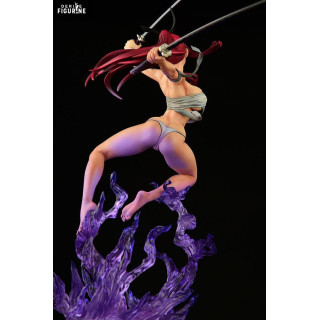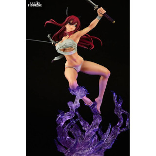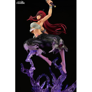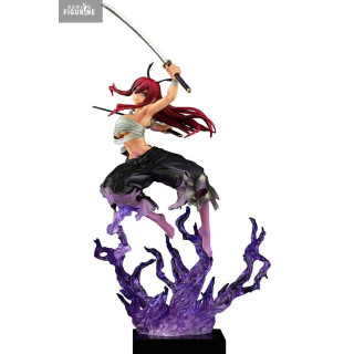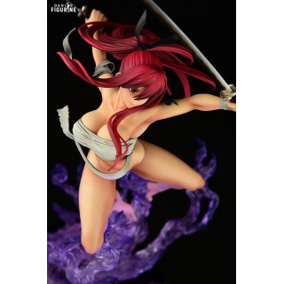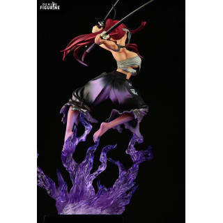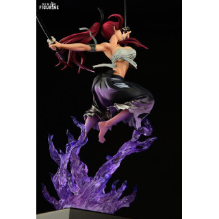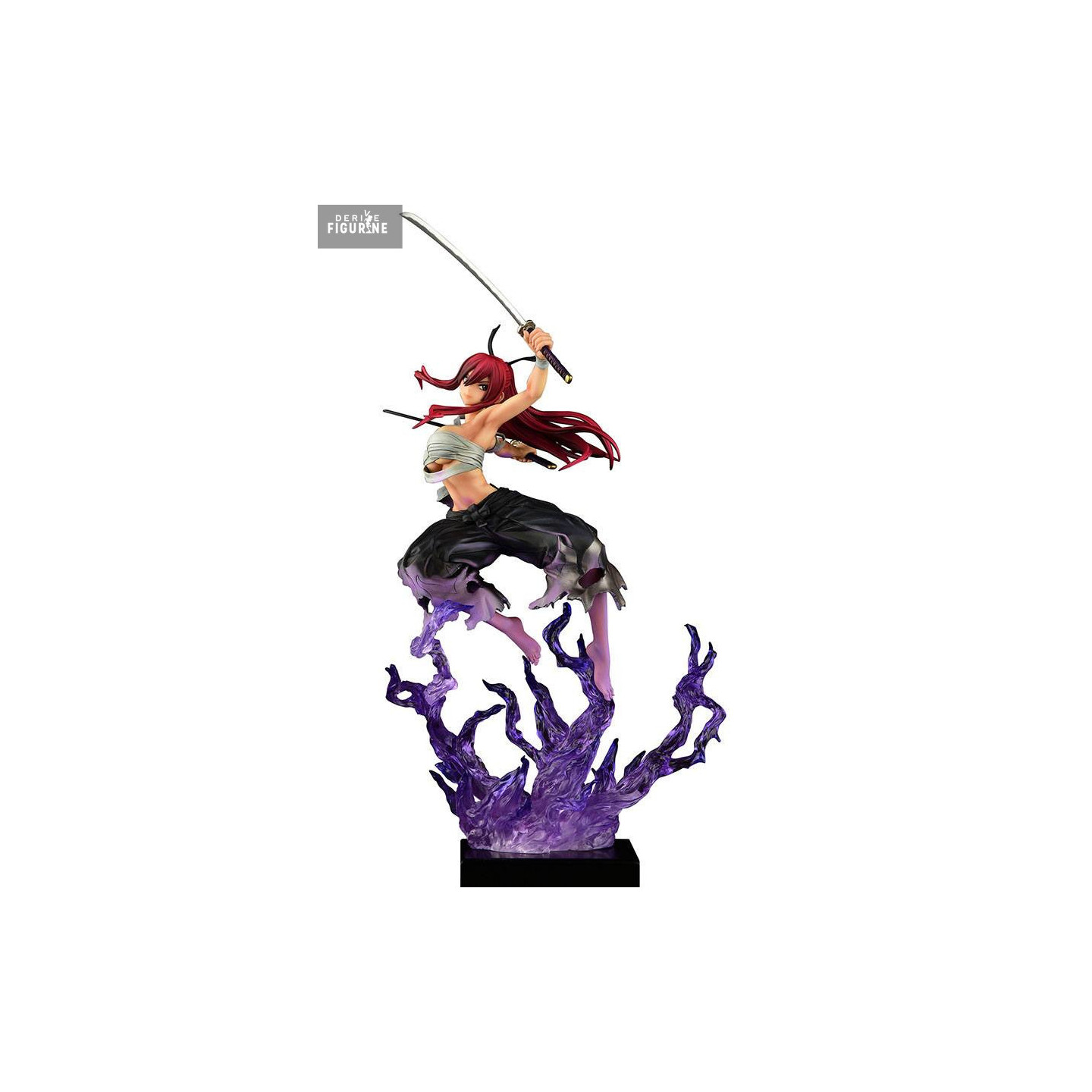 The translucent purple flame effect is a visual standout, lifting Erza as if she’s floating in the heat of battle. Details are crisp throughout: from her flowing scarlet hair to the sculpted folds of her clothes and the sharp edge of her katana, everything is crafted to maximize dynamism and impact.
