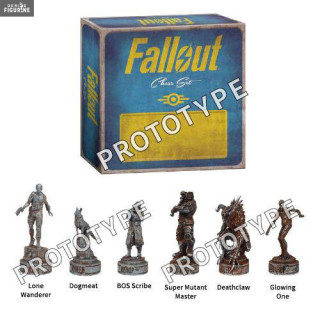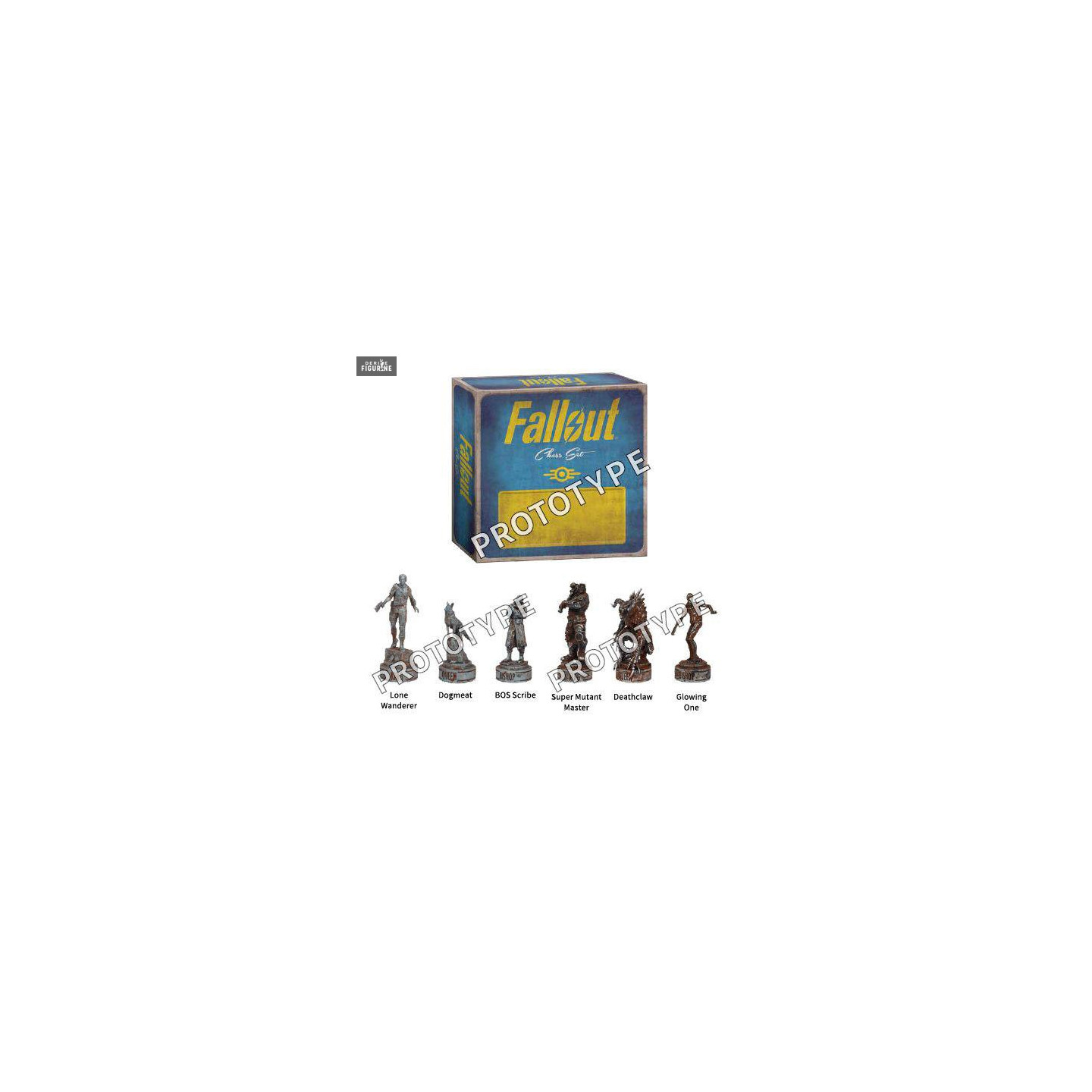 Fallout official chess game with 32 vinyl pieces between 3 and 6 centimeters high. The manufacturer is USAopoly.