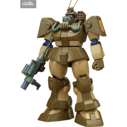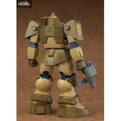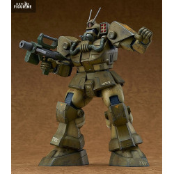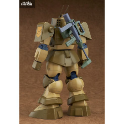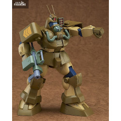 The design sticks closely to the anime version: sandy armor with bold lines, visible mechanical components, a yellow triangle emblem on the right shoulder. Chest tubing, a dorsal antenna, oversized shoulders, and a shoulder-mounted rocket launcher complete the aggressive loadout. The two-handed firearm enhances its imposing, combat-ready look.
