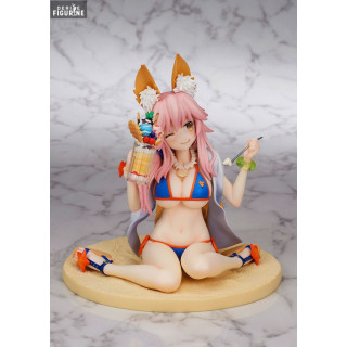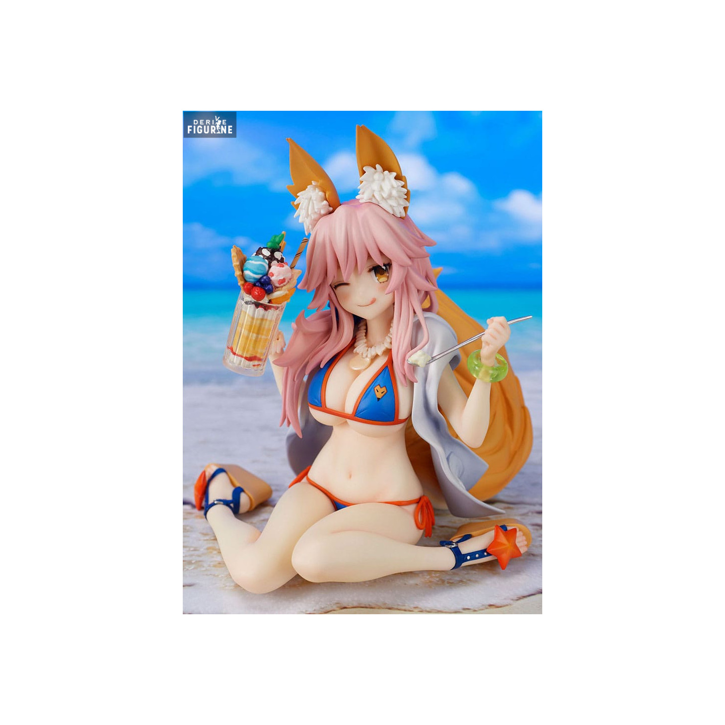 This official figure of Tamamo no Mae, standing approximately 16 centimeters tall, is made of PVC by Flare. It depicts Tamamo in a joyful and relaxed pose, seated on sand, holding a colorful dessert and wearing an orange and blue swimsuit. Her flowing pink hair, distinctive fox ears, and fluffy tail are intricately recreated with remarkable precision. Every detail, from the folds of her beachwear to the texture of the sand beneath her feet, reflects the care taken in crafting this collectible piece. Perfect for completing a Fate collection or capturing the essence of summer, this figure is a must-have for fans.