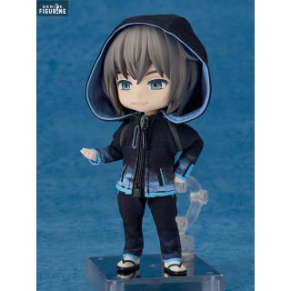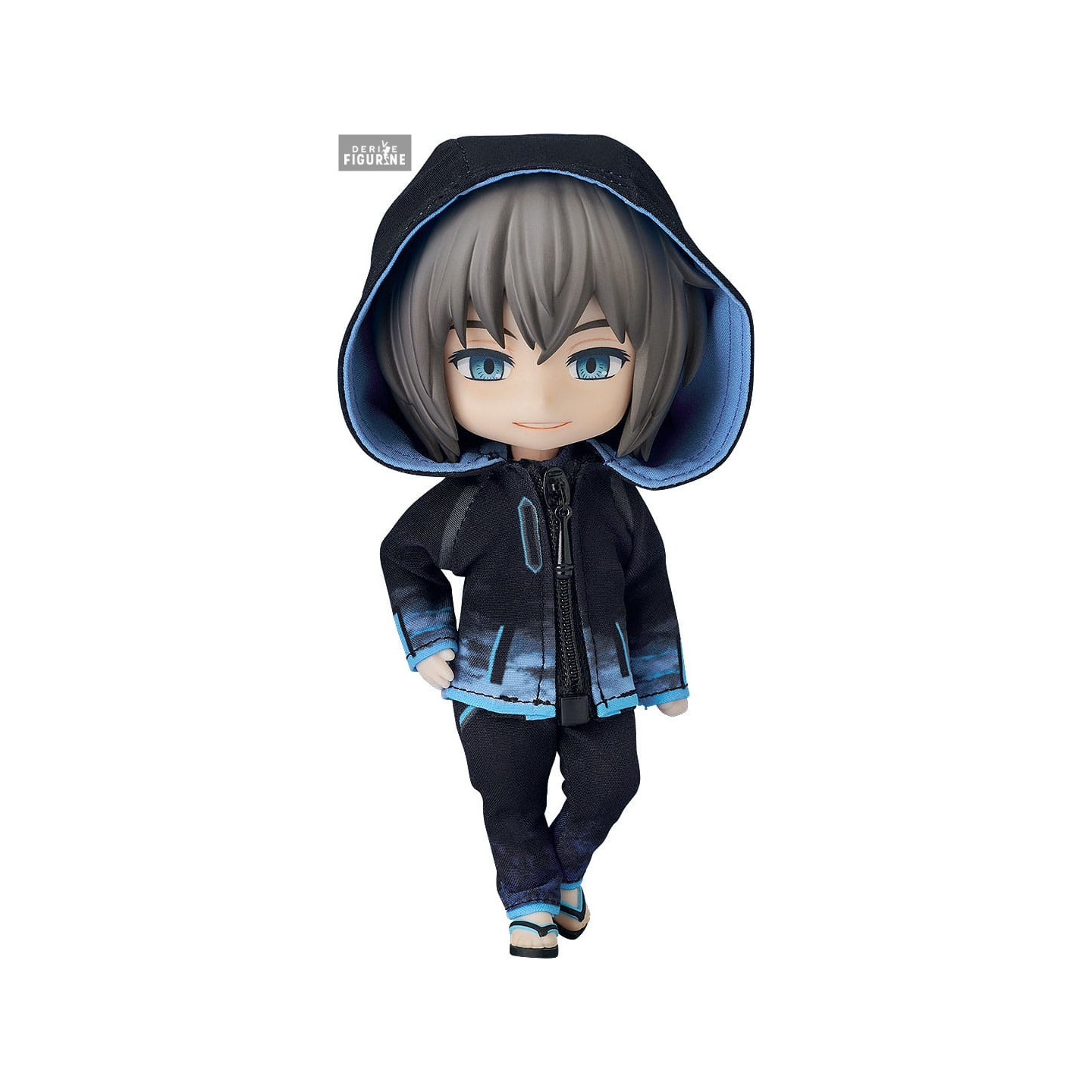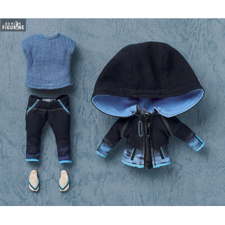 This figure follows the Nendoroid Doll format, blending chibi proportions with real fabric clothing. The folds in the fabric, the gradients on the hoodie, and the scale-accurate stitching are all carefully crafted. You can pose him freely using the articulated clear stand, and swap out facial expressions for different moods.