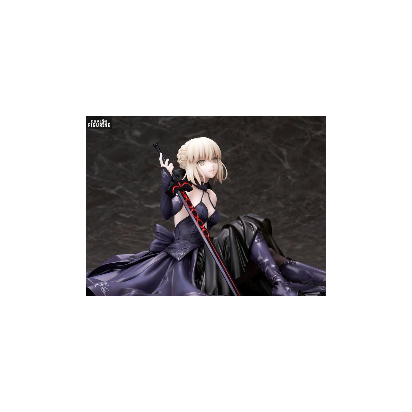The highlight of this piece is her Excalibur Morgan, whose black and red blade contrasts beautifully against the softness of the flowing dress. Measuring 13 cm in height and 27 cm in width, this figure captures the fatal beauty of Saber Alter in a unique pose. Crafted from high-quality PVC, this is an essential collectible for all Fate/Grand Order enthusiasts.