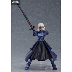 The Figma figure captures this look in detail: dark blue armor with sharp edges, black and red highlights, a flowing skirt, and her signature sword — the blackened Excalibur Morgan etched with red marks. Her face is partially obscured by a mask, adding to her silent menace. The sculpting emphasizes contrast and control.