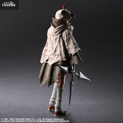 The Play Arts Kai sculpt captures her distinctive attire: a tattered cream poncho layered over an olive tunic and complemented by a voluminous scarf, all accented by rust and cream hues. Contrasting textures—rough fabric, tanned leather, and aged metal—are expertly rendered, while the moogle hood topped with a red pompom frames her primary serious expression. An alternate smiling faceplate offers versatility, from covert infiltration to surprise assault.