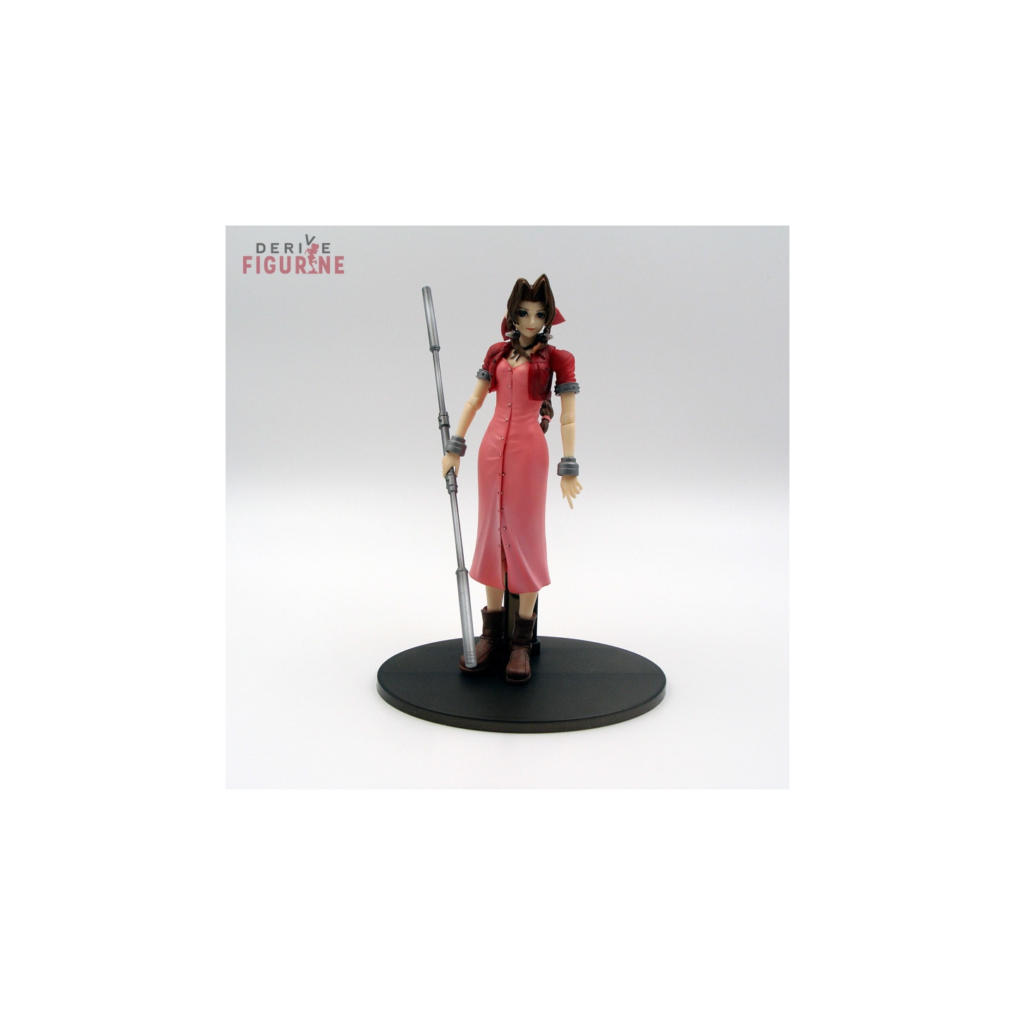Second-hand and official Aerith Gainsborough figure in ABS/PVC about 19,5 centimeters high. It is articulated and has all its accessories, namely two spare hands, its weapon and the base. This is a second-hand item in perfect condition from the Play Arts collection. The manufacturer is Square Enix, sold with box in good condition but a little detached in the back.