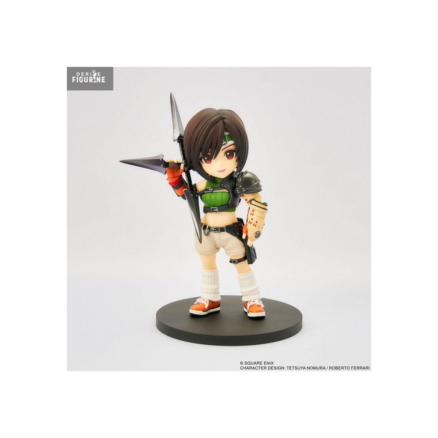 Dressed in her signature outfit, featuring her green top, ninja accessories, and distinctive bandana, Yuffie is depicted holding her legendary shuriken, ready for action. The precise details of this figure, including her lively facial expressions and dynamic pose, pay tribute to Yuffie’s cheerful and fearless character. Whether decorating your desk or completing your Final Fantasy collection, this figure is the perfect addition.
