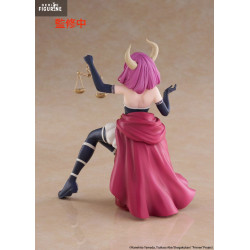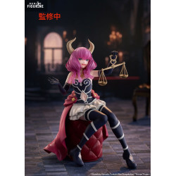 Seated gracefully on a tufted cushion, Aura holds her signature golden scales—an emblem of her overwhelming power. Her outfit mirrors the anime design: a black and white bodice with spiral motifs, a vivid red cape draped behind her, and long gloves and thigh-high stockings that emphasize her regal posture.