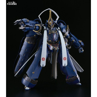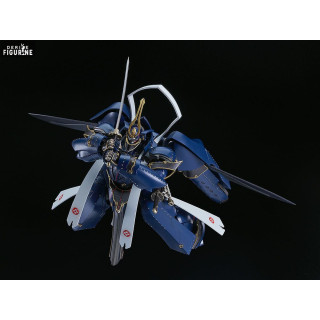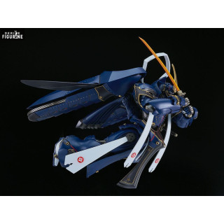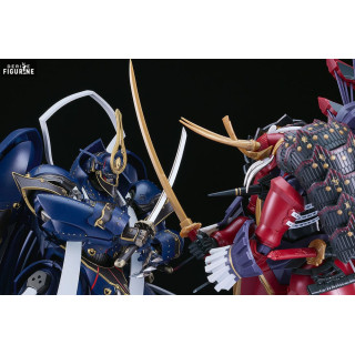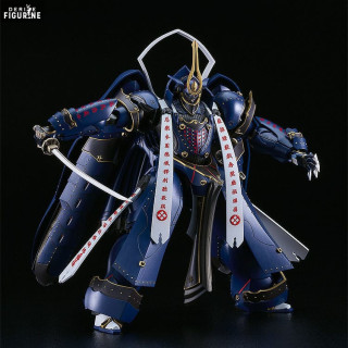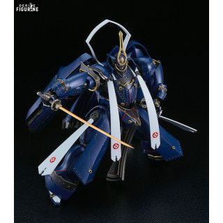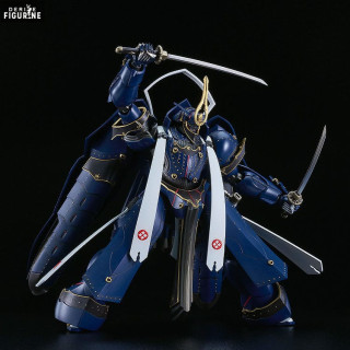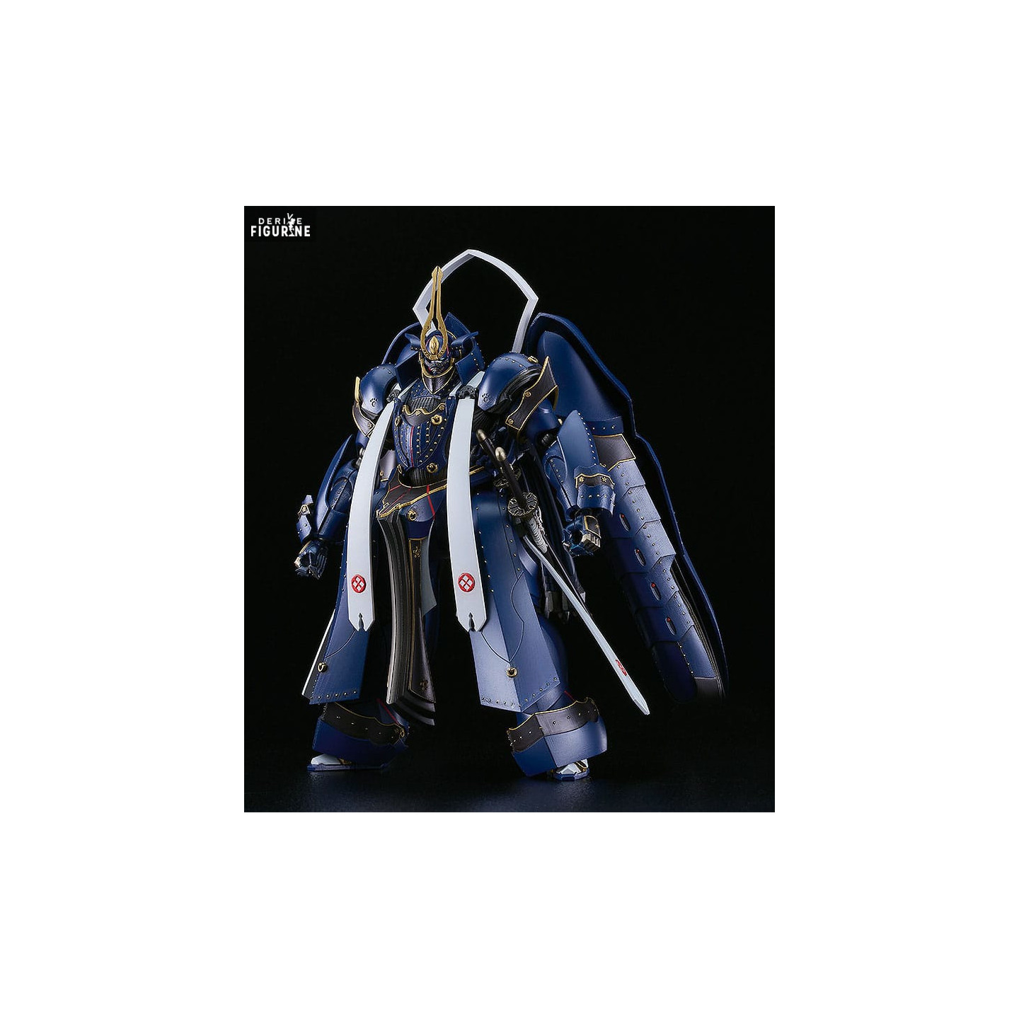 Soushuu Gorou-Nyuudou Masamune is a majestic war machine clad in a deep blue armor adorned with gold details and traditional motifs. Its imposing appearance is enhanced by massive shoulder plates, an iconic helmet with a striking front ornament, and a finely detailed katana, embodying the warrior's spirit. The intricate design highlights exceptional craftsmanship, paying homage to the art of samurai armor while integrating a futuristic touch.