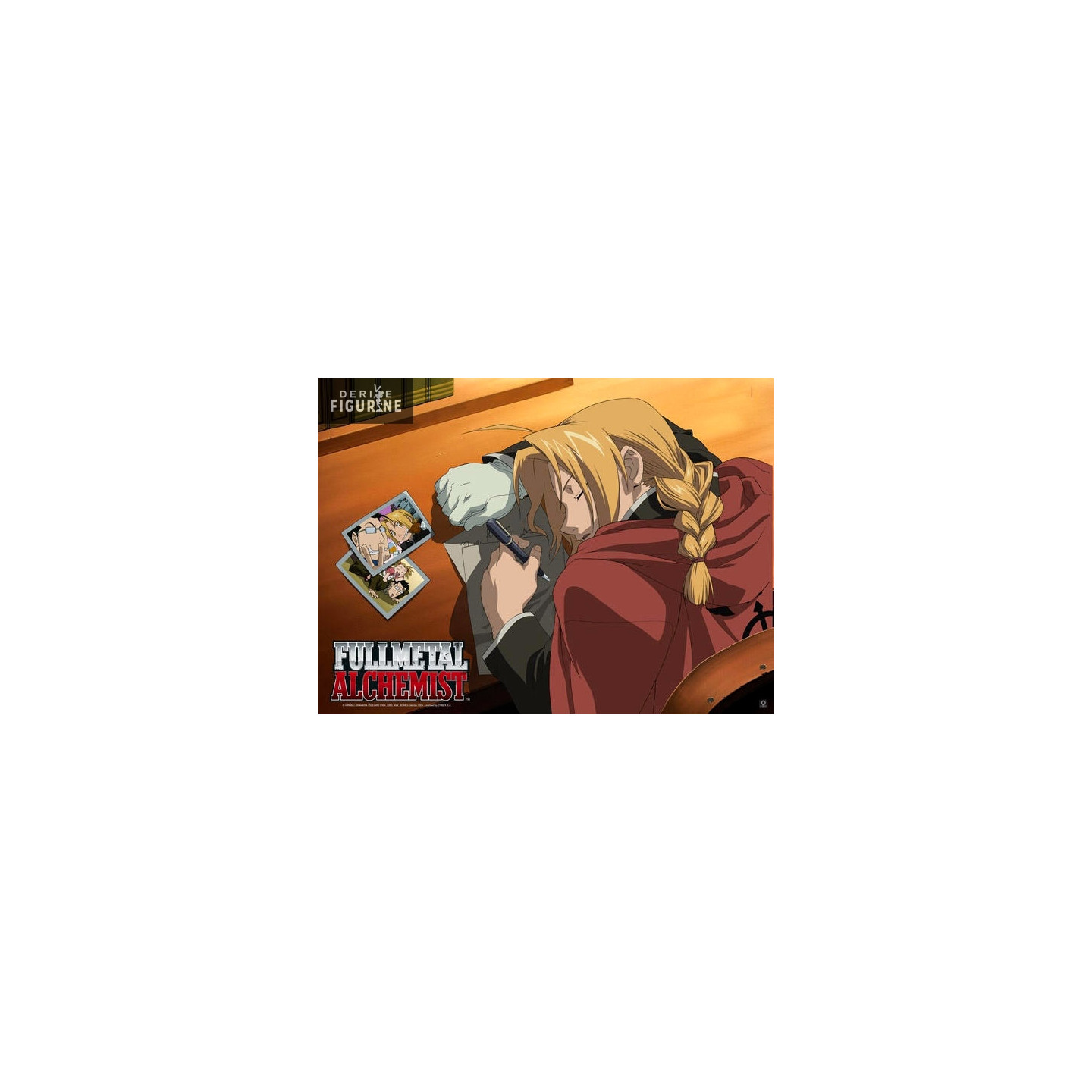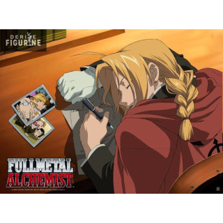 On this poster, we can see that Edward was writing a letter, but unfortunately, it seems that he was dozing off before he could finish. On his desk are also two pictures, the first where he is with Maes Hughes and the second on which Maes plays with her daughter.