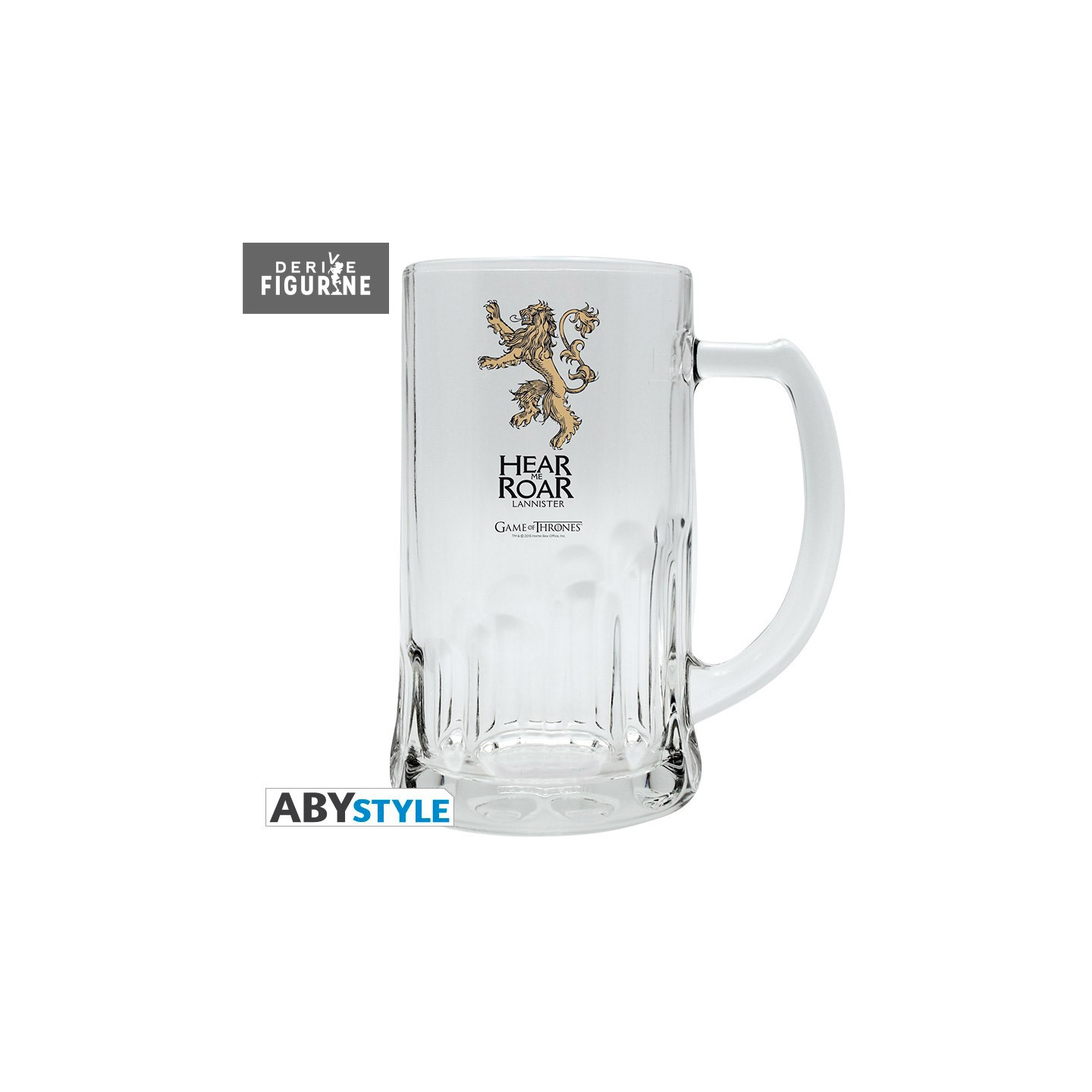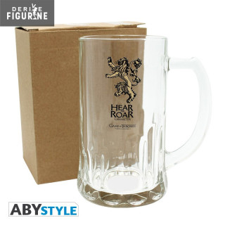 Game of Thrones tankard in glass. It is about 16 centimeters high. It's capacity is 50 cl and it resist more than 700 dishwasher washes. The manufacturer is ABYstyle.