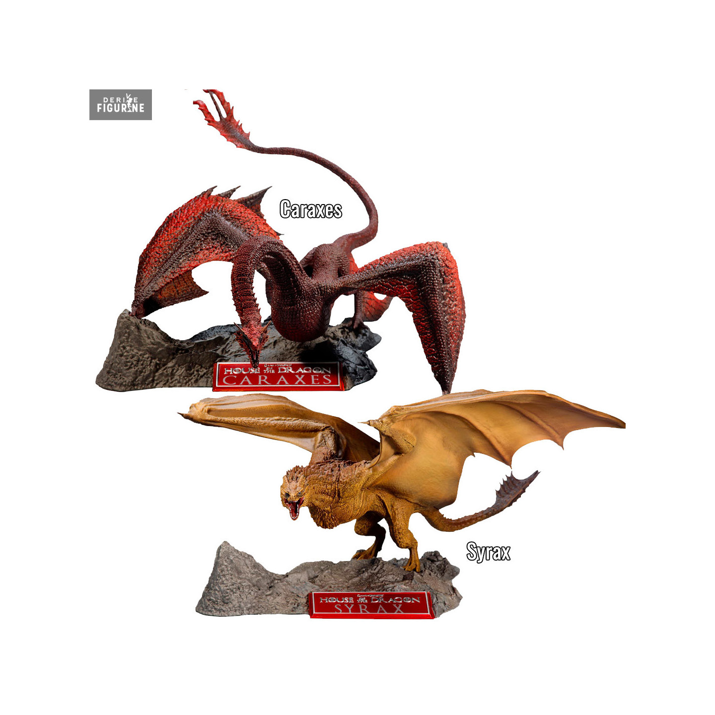 Official figure of your choice between Caraxes (~ 20 cm) or Syrax (~ 17 cm) in PVC. The manufacturer is McFarlane Toys.