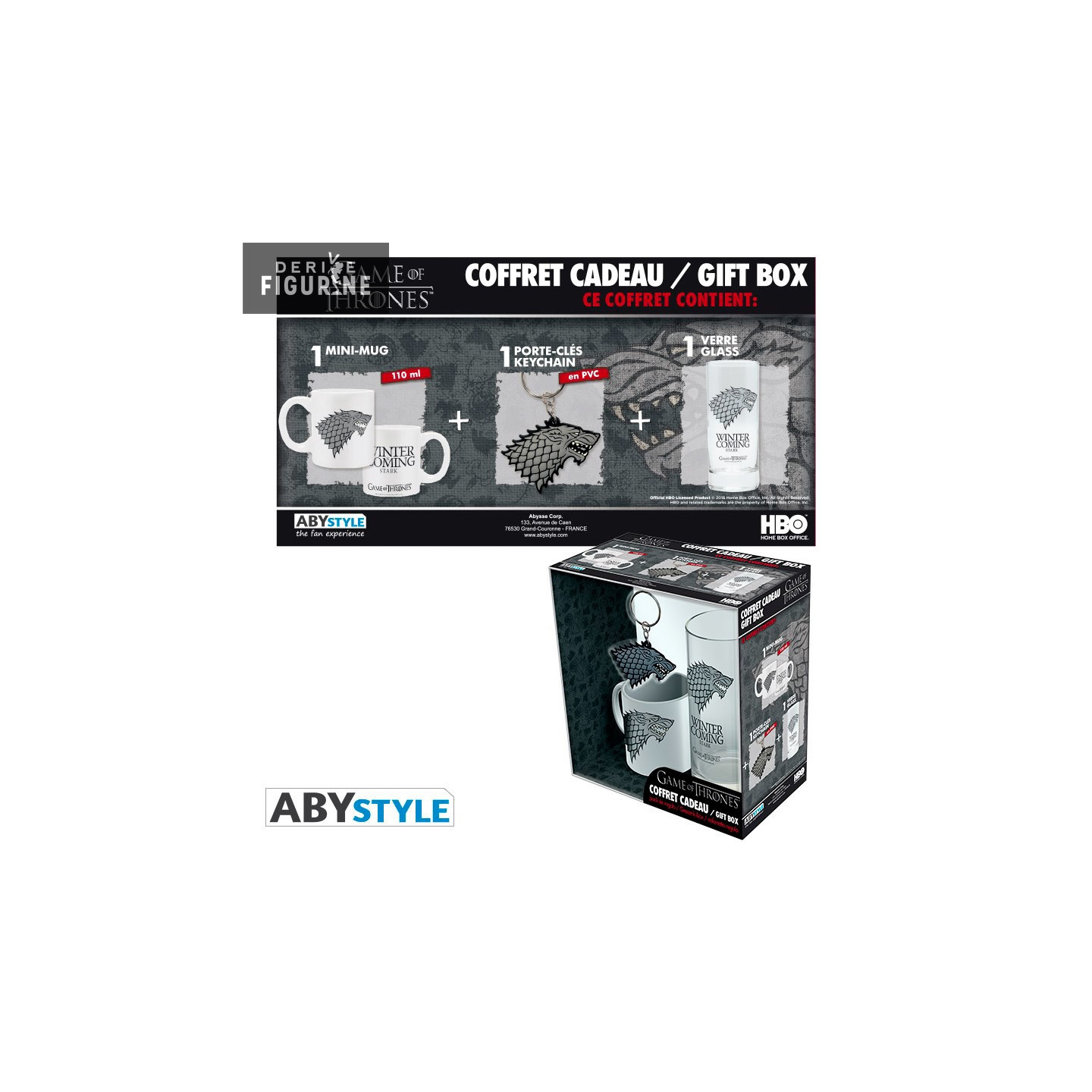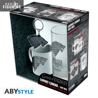 Want to give a Game of Thrones gift to a friend but you do not know what to take? Here is an ideal gift box for the occasion. It contains a mini-mug of 11 cl, a keychain of PVC and finally a glass of 29 cl. The whole, bearing the effigy of the house Stark.
