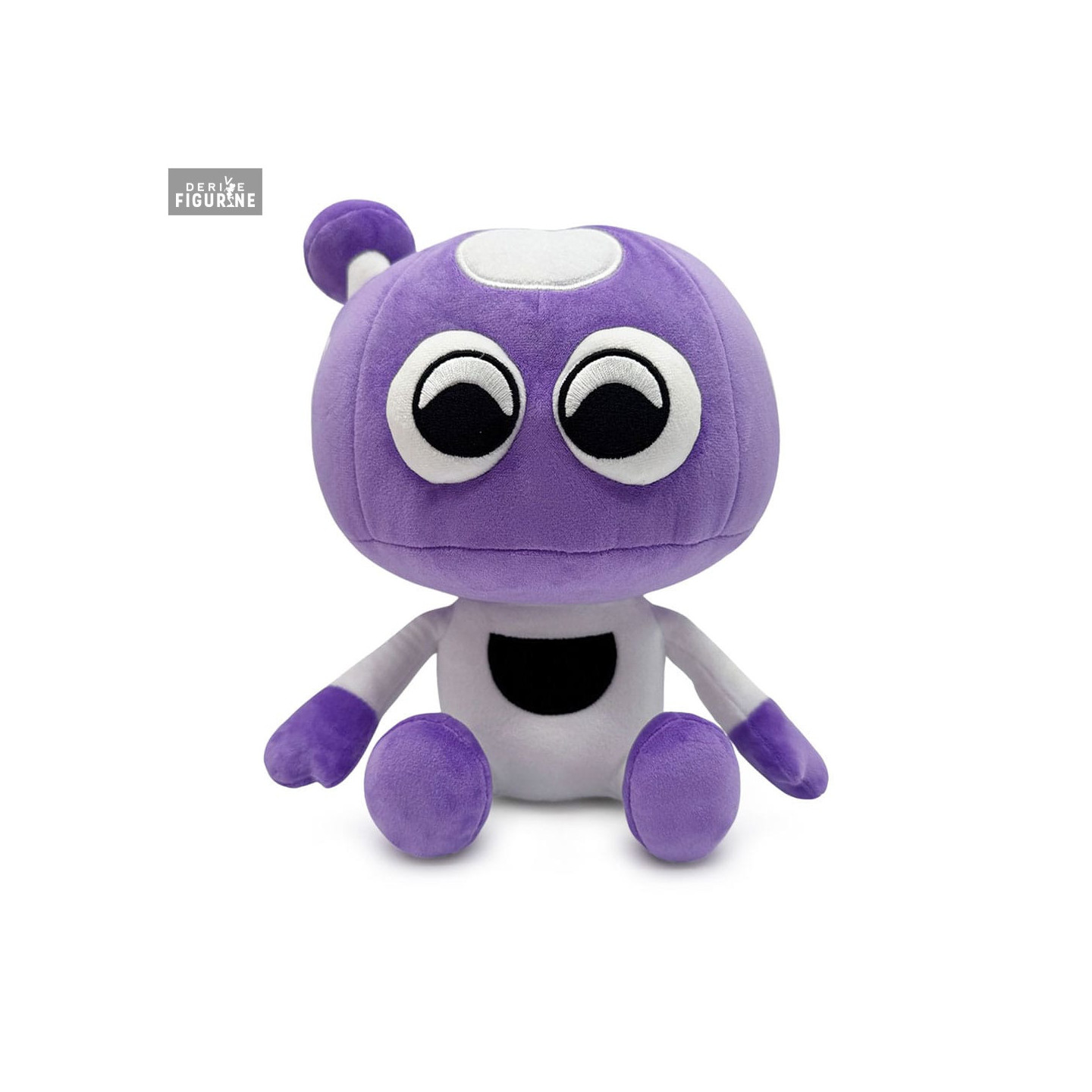This official plush faithfully captures every detail of its mischievous design: a large rounded head in soft violet velour, a cream-colored body emblazoned with a black half-circle “belly,” and long little arms poised to wave at brave explorers. Its oversized embroidered eyes, accented with white stitching, and its subtle stitched mouth give it an expression that’s both curious and affectionate.