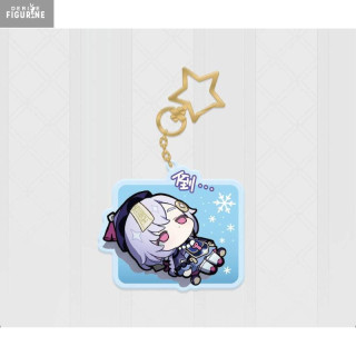 This official keychain, part of the Q Version Sticker Series, features Qiqi in an irresistibly adorable chibi style. Produced by MiHoYo, it is made from high-quality acrylic and measures approximately 9 centimeters tall. The design shows Qiqi lying down, accompanied by snowflakes and an adorably sleepy expression, perfectly capturing her dreamy nature. With a golden star-shaped clasp for an elegant touch, this keychain is both a practical accessory and a beautiful collectible. Perfect for personalizing your keys, bags, or belongings, this product is a must-have for all Genshin Impact fans.