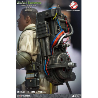 The Proton Pack, an essential device for capturing ghosts, is finely detailed with its cables, lights and components, perfectly mimicking the equipment seen in the films. Winston also holds his plasma pistol with a confident posture, ready to face any supernatural threat.
