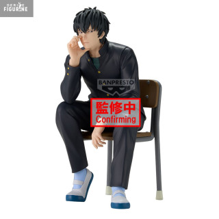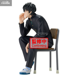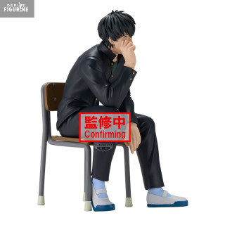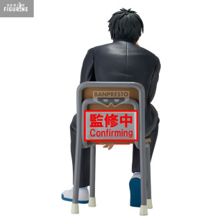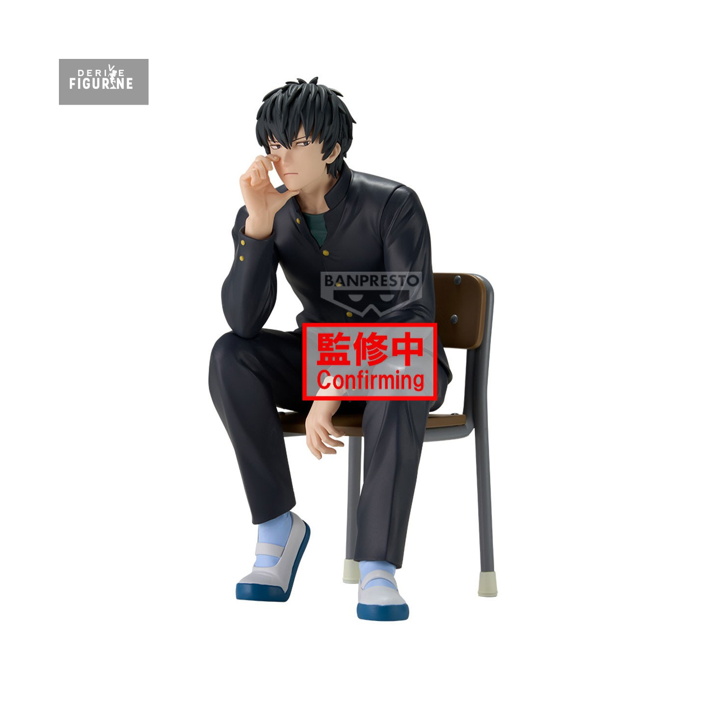 In this Desktop Figure, his black school uniform—buttoned jacket with gold buttons, matching pants, and a green T-shirt underneath—is meticulously recreated: every fold and seam is sculpted to convey the fabric’s natural drape. His tousled hair, rendered in a matte finish, shows subtle highlights and depth, while the unadorned chair lends a touch of everyday realism, reminding us that even elite warriors pause to wait.
