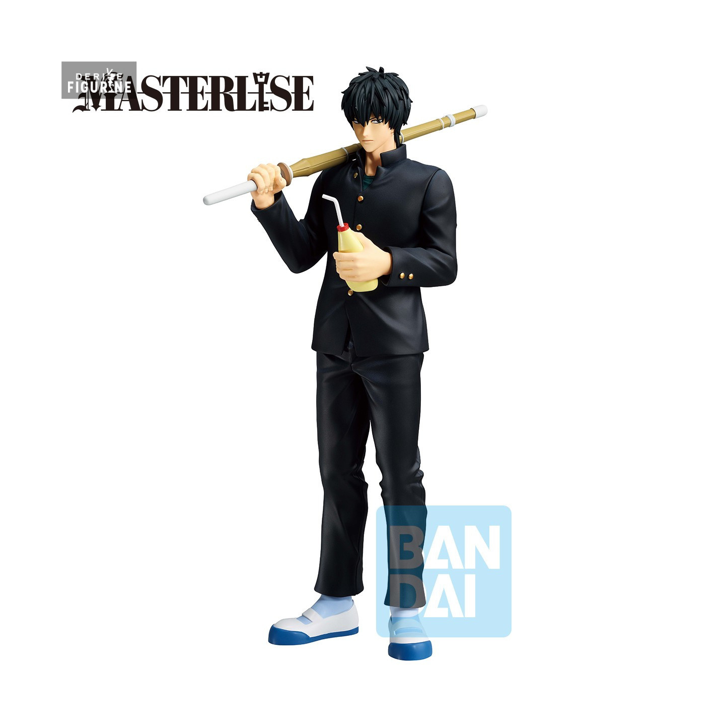 This figure shows him in a relaxed yet confident stance: he rests a bamboo sword over his right shoulder while holding a bottle of sauce with a straw in his left hand, a playful nod to his unusual culinary passion. He wears a black school-style uniform with a buttoned jacket and matching trousers, paired with white-and-blue shoes.