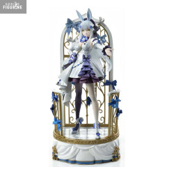 The figure keeps the same graceful pose — arm extended, serene expression — but now stands on a fully decorated base: a sculpted white platform with gold accents and a flower-adorned arch behind her, tied with deep blue bows. The luxurious setup turns the figure into a centerpiece diorama.