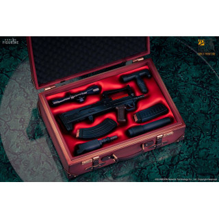 The red case contains all the accessories of the OTS-14 assault rifle and the beautiful young woman is its representation in the mobile game Girls Frontline. You can see she was wearing a pretty sexy dress, but she got some damage that tore her clothes.