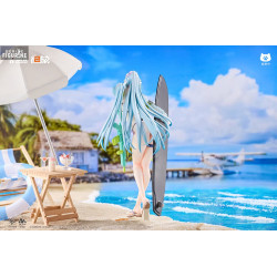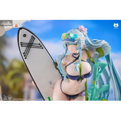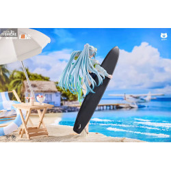 Her appearance is rich in visual details: long flowing aqua-blue hair, a diving mask adorned with a shell, and tropical flower accessories around her ankle, waist, and thigh. She holds a black surfboard by her side, and the sandy base — complete with starfish — enhances the beach atmosphere. Her bangs partially hide her eyes, adding a mysterious charm.