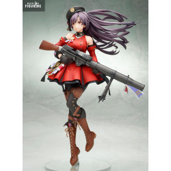 The design is highly detailed: long flowing violet hair, red dress adorned with gold trim and blue-white-red ribbons, asymmetrical tights, lace-up heeled boots, and the faithfully sculpted Lewis gun with textured detailing. A black officer’s cap completes her dignified and powerful look.
