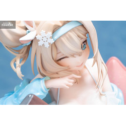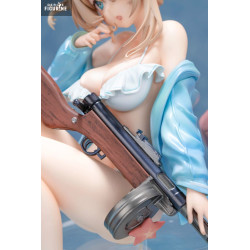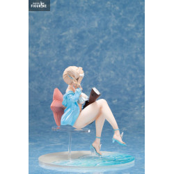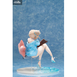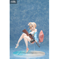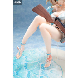 She wears a white ruffled one-piece swimsuit with a light blue jacket slipping off her shoulders. Tied sandals, a beige ribbon in her hair, and the finely sculpted weapon add carefully chosen details. Her blonde hair flows naturally, and the base mimics a beach shoreline with a translucent water effect.