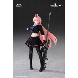 Design-wise, the figure recreates her long pink hair tied in a low ponytail, with bangs framing her face and a small pink beret perched on top of her head. She wears a dark outfit reminiscent of a reworked school uniform: a black sailor-style top with pink trim, a blue ribbon at the chest and a short matching skirt. Her legs are covered in black tights with knee pads and detailed brown shoes. She carries an oversized black-and-grey sniper rifle, featuring a long barrel, large stock, bipod and scope, its length contrasting with her slim build. Visible joints at the arms, legs and torso allow you to set up different poses with her weapon when displaying the figure.