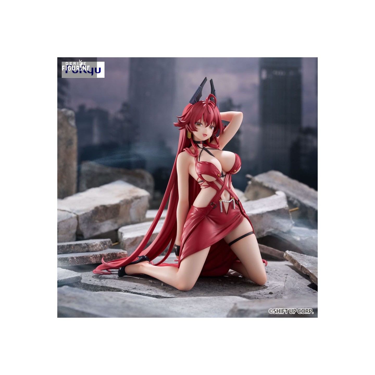 This Noodle Stopper figure faithfully captures her iconic look: flowing, flame-red hair, mechanical wolf-ear hood, and a piercing gaze accentuated by bold makeup. Her outfit—glossy red leather accented with crisscrossing straps—sculpts her slender form while hinting at concealed tech armor. The pose, one knee down and one arm raised behind her head, conveys her provocative, self-assured attitude.