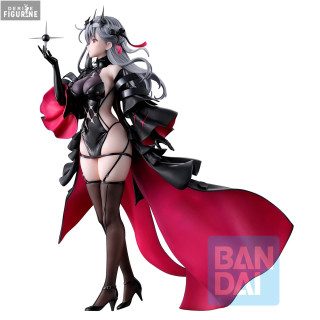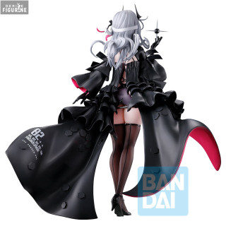 In this Ichibansho collection version, Modernia stands tall with a confident and captivating posture. She wears a sleek black bodysuit with intricate design details, accented by a vivid red lining inside her flowing cape. A corset with a sophisticated chest motif adds depth to her outfit, while her long silver hair is adorned with black accessories. In her left hand, she holds an object reminiscent of a weapon or artifact, further enhancing her aura of power.